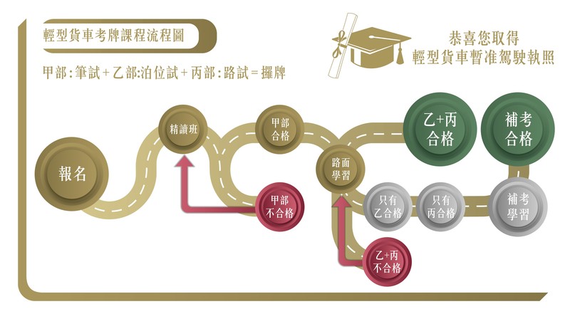 要成功取得輕型貨車駕駛執照,必須先通過甲部(筆試)考試。筆試及格後申請學習駕駛執照,然後再考乙部(泊位試)及丙部(路試)考試。當乙部及丙部均及格後,便可取得輕型貨車的暫准駕駛執照。
